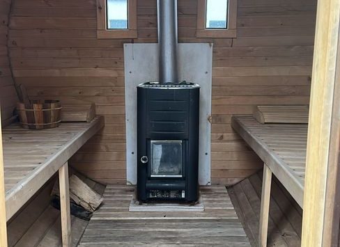 • Große Glastür für angenehmes Saunieren mit gemütlicher Holzfeuerung.